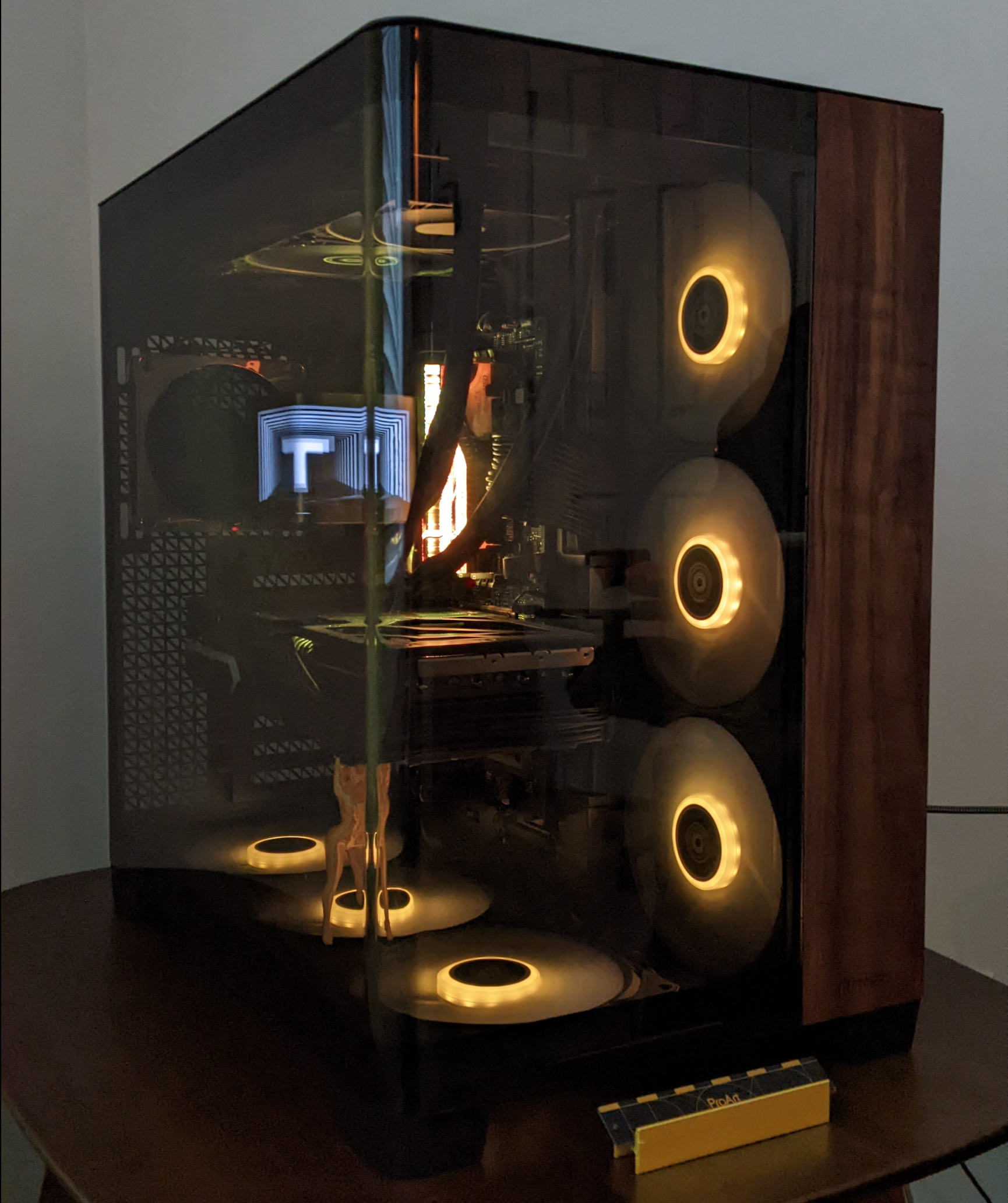 I was thinking of ways to match the wood inside the case. Initially I thought about finding wood colored or stickered fans; the closest were Noctua fans, but I didn't like the white casing and others I looked at were too loud for this build. Then I saw fan grills and was reminded those are a thing: and I found some on Etsy that were really cool. Especially with some light underneath I figured these would complement the build well! I ordered a gold anodized GPU bracket but that never arrived, so I used a cheap RGB one until I printed a custom support for it (initially a steel beam, then the figurine). I've considered re-sleeving the PSU cables in black/gold as well, but that's not high on my list of priorities right now.